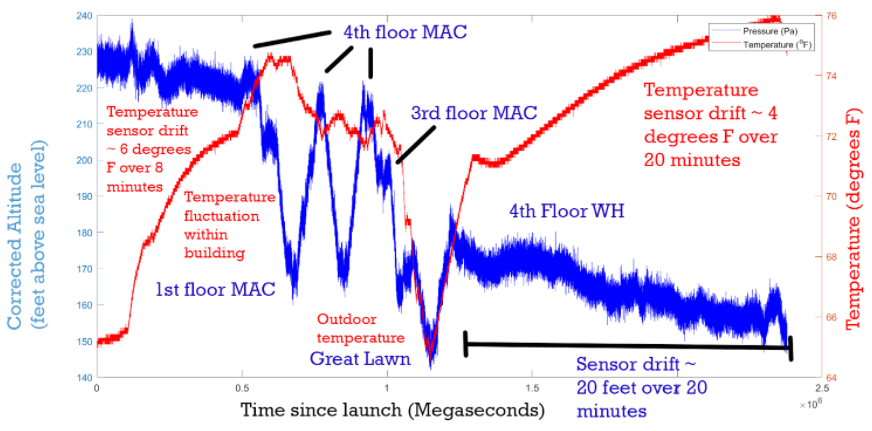 Results: The readings are inaccurate, yet very precise. The pressure has reads on the order of 200 kPa, which is double what is expected (1 atmosphere is about 100 kPa), and the temperature reads 90 degrees F in a 70 degree room. Yet after the offset is subtracted, the sensor tracks changes in height of less than 20 feet (the distance between floors in the MAC, and the highest resolution analyzed) quite well. The graph below shows the corrected elevation and temperature over the course of my trip up and down the stairs of the MAC, then outside onto the great lawn and up to the 4th floor of West Hall. There is some drift over time as it sat on my desk after “landing,” on the order of 20 feet over 20 minutes. This is worrying, but it will likely not be a problem during a launch lasting a few minutes.