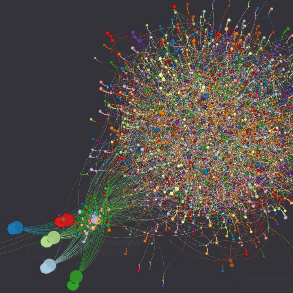 plotter.plot(links)Let's size nodes based on their PageRank score and color them using their community. IGraph already has these algorithms implemented for us. If IGraph is not already installed, fetch it with pip install python-igraph. Warning: pip install igraph will install the wrong package!