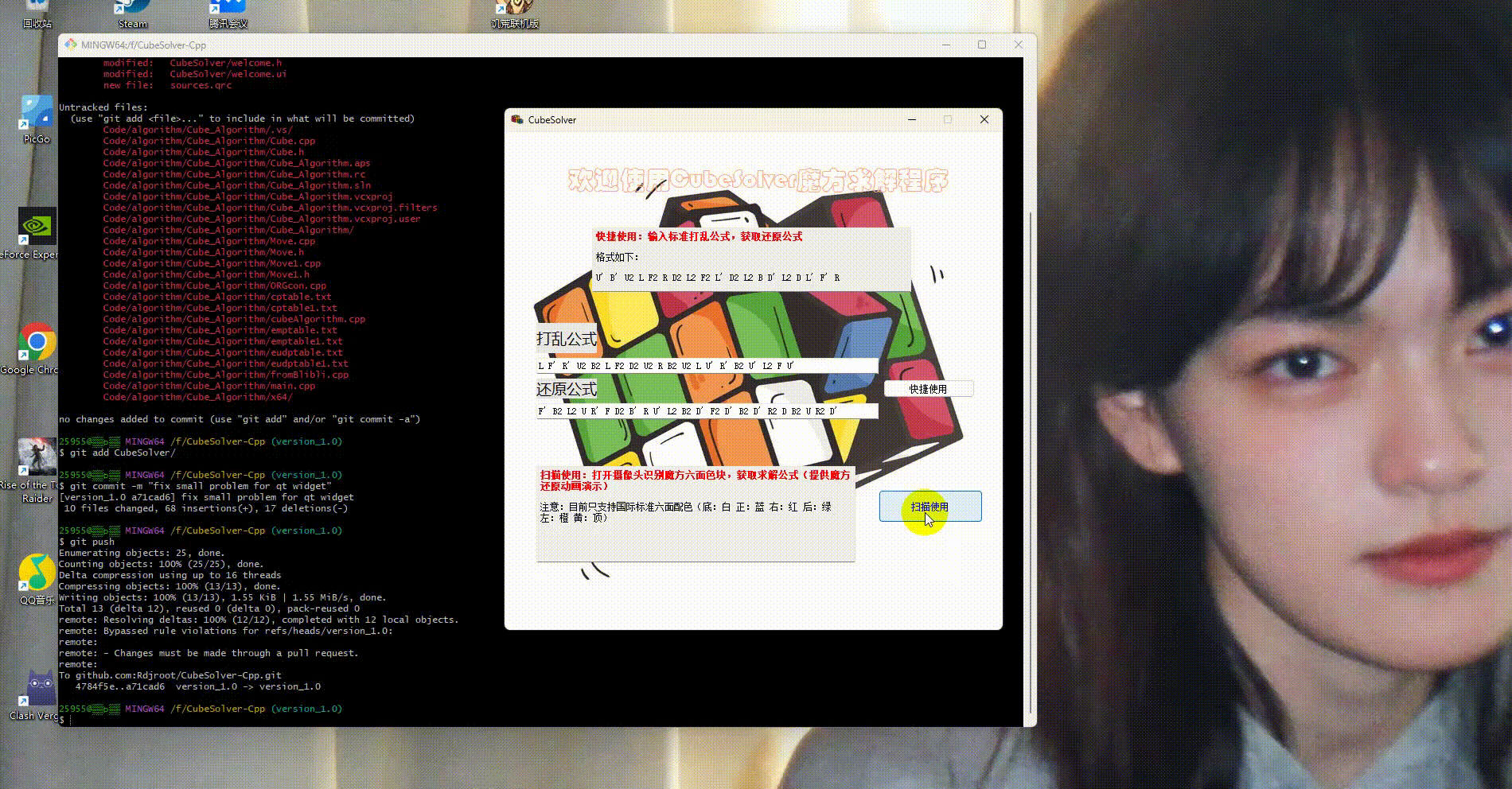 实现了输入打乱公式提供还原公式的功能,以及通过摄像头扫描识别魔方六面,获取魔方还原公式,且提供3D魔方图像动画演示。