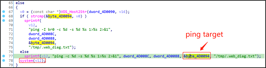 There are ping and traceroute tools in the web management page of the device, the user can enter the test target, but the background program does not filter and check the user's input, directly splicing the string and then calling the system function to execute, causing a command injection vulnerability.