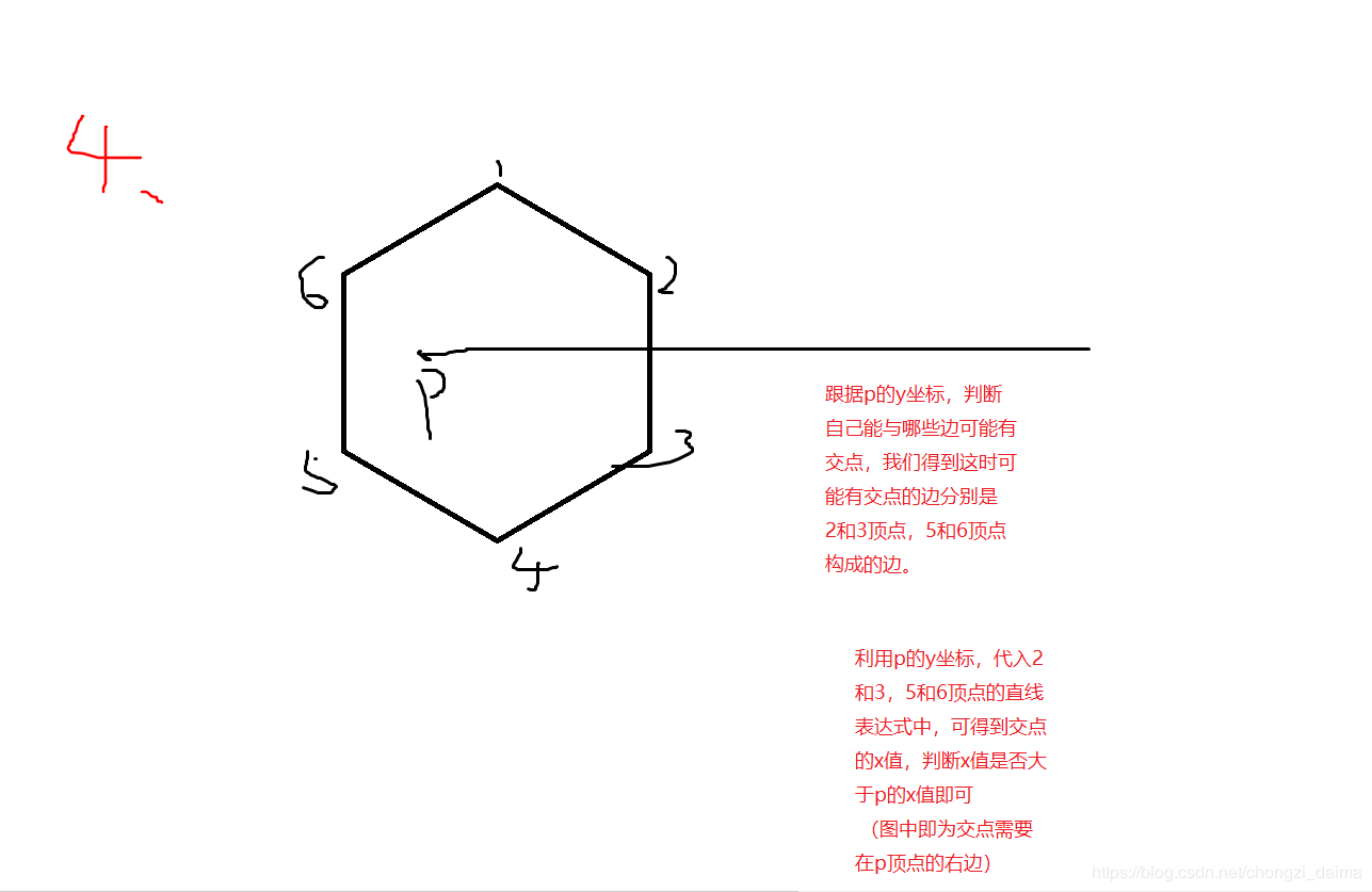 Ray-Crossing算法实现: 大概思路是从指定点p发出一条射线(我们以点击点向右水平方向发射),与多边形相交,假若交点个数是奇数,说明点p落在多边形内,交点个数为偶数说明点p在多边形外。算法结论乍看难以理解,但在逻辑上是可证的,之后我们筛选可以存在交点的边,比如 p 的y为1,我们不可能选择两个构成边的顶点的y值都大于1或者都小于1的,因为这样没有意义,根本不会有交点。筛选出的边,我们利用 y=kx+b 来表达。 利用两顶点坐标,求出表达式的k,b值,之后求 y=p.y这条直线与筛选出的边的交点,求出交点的x值,如果x值大于p的x值,说明该交点有效,小于p的x值,该交点无效,因为由p向右的延长线为射线,不会与x值小于p的x值有交点。