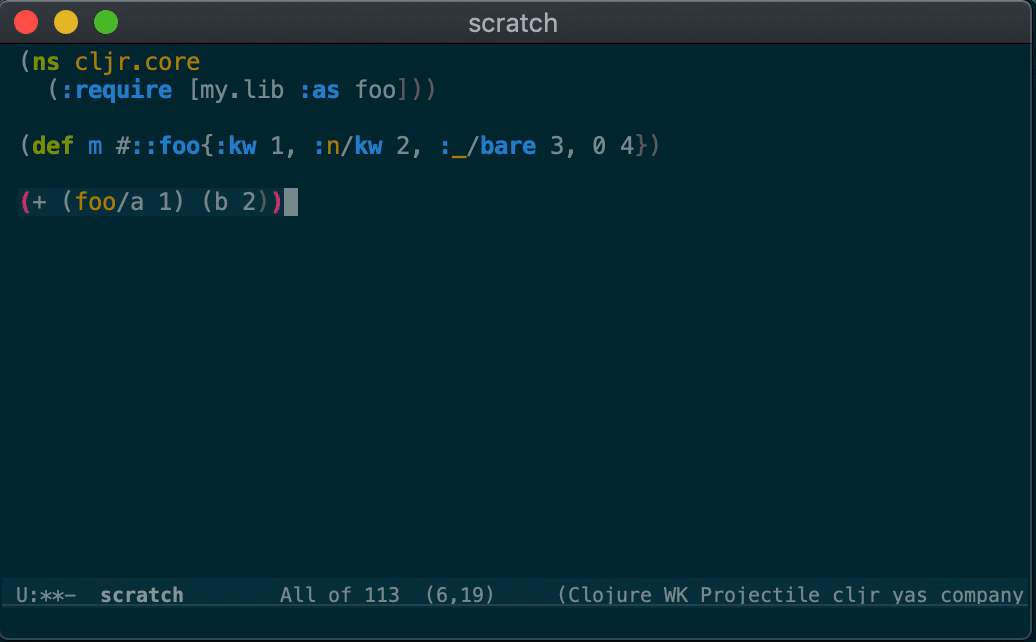 You can also use the code in this package as a basis for extending the font-locking further (e.g. functions/macros from more namespaces). Generally you should avoid adding special font-locking for things that don't have fairly unique names, as this will result in plenty of incorrect font-locking. CIDER users should avoid this package, as CIDER does its own dynamic font-locking, which is namespace-aware and doesn't produce almost any false positives.