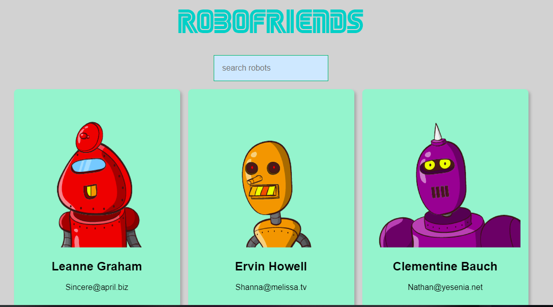 RoboFriends Simple app on React.js with filter Preview Technologies: React.js CSS How to install localy: Clone/download this repo npm install npm start