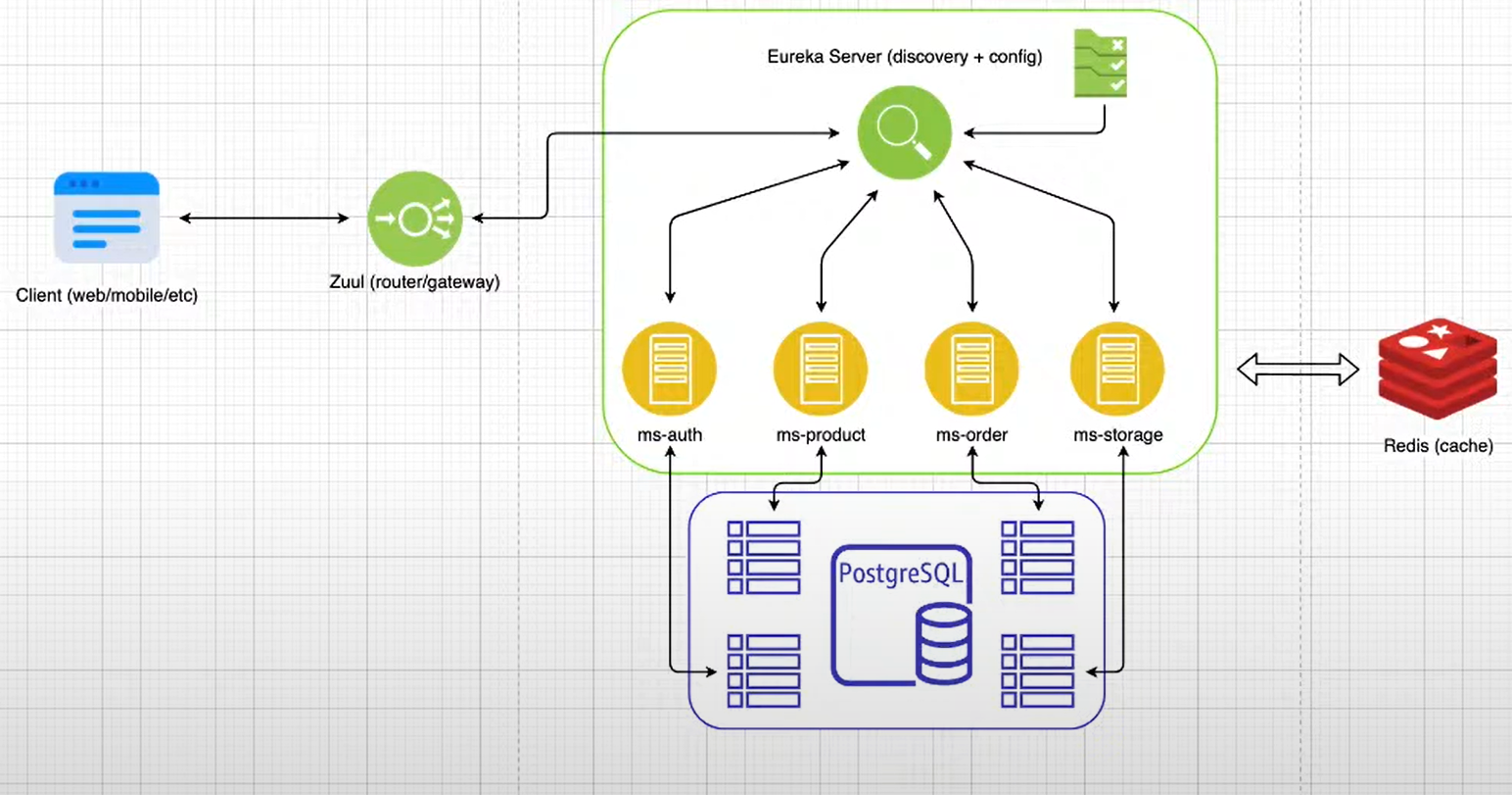 - Spring Cloud (Discovery server Netflix Eureka + OpenFeign + Gateway)