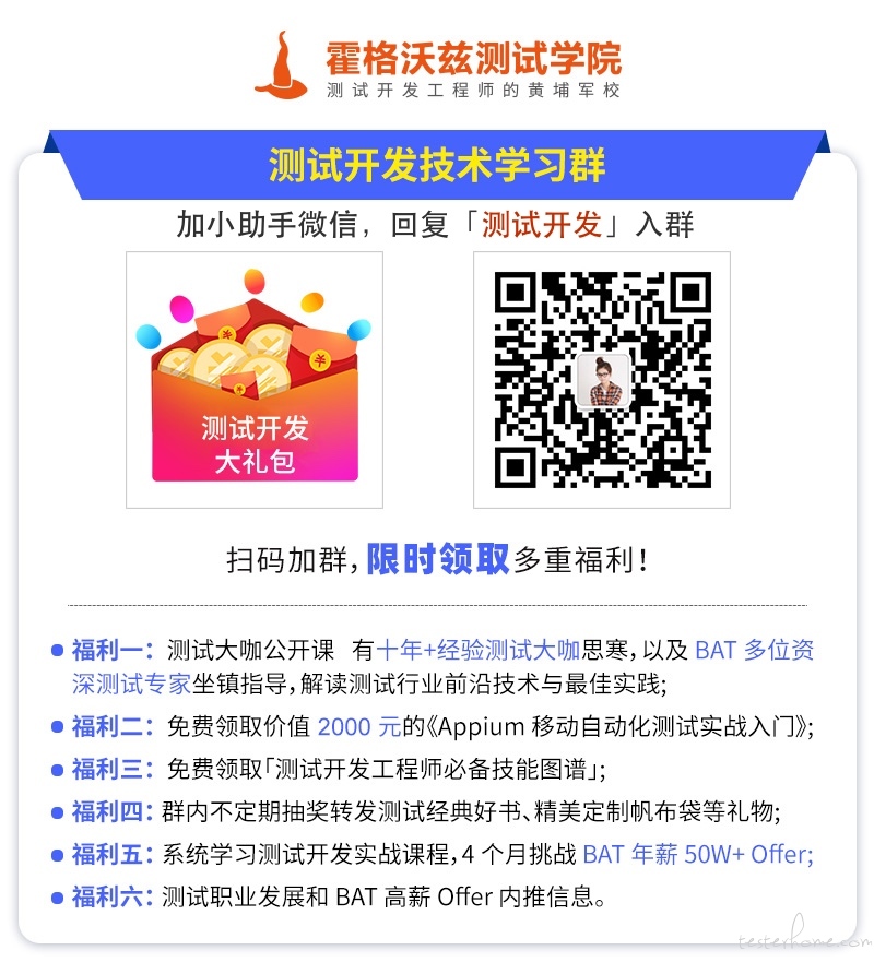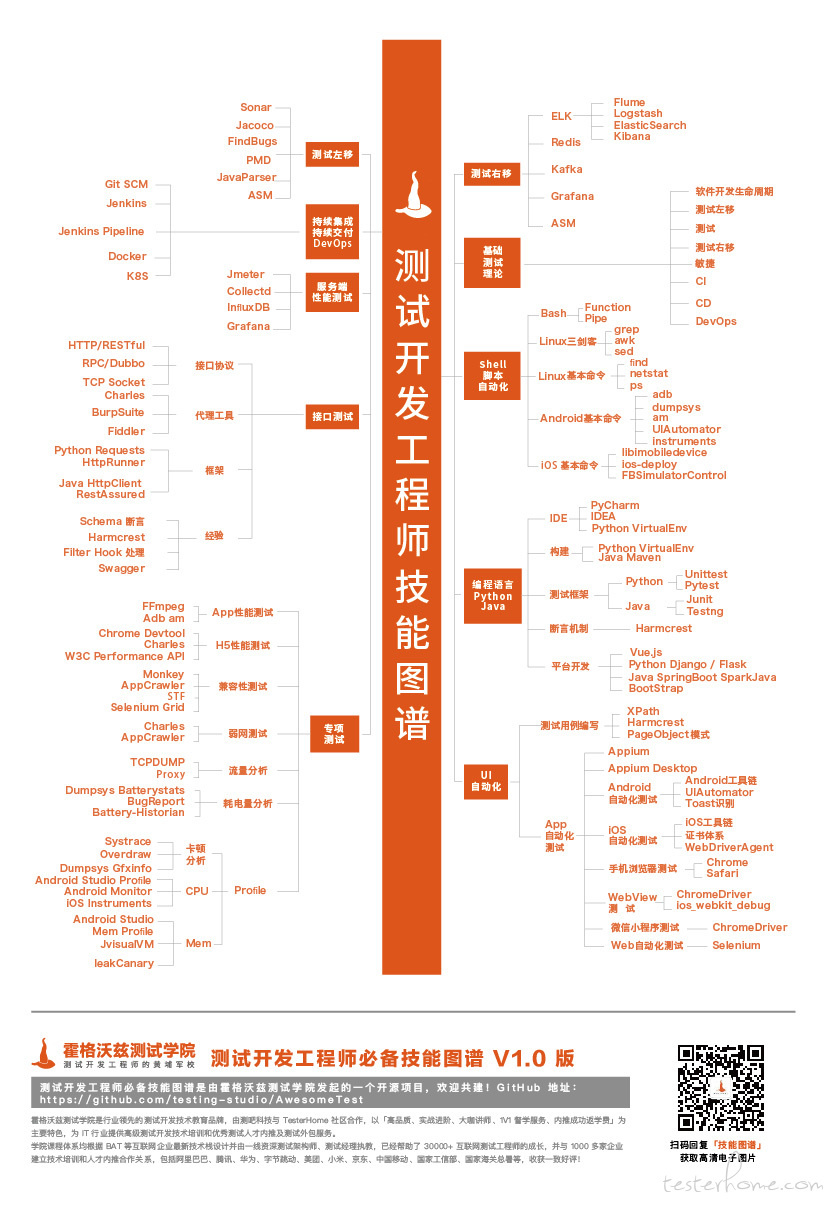 AwesomeTest | 测试开发大全 测试开发大全是霍格沃兹测试学院发起的一个测试开发技术精品学习资源集合。主要包括测试开发工程师必备技能图谱 | 测试工具利器推荐 | 测试好书推荐 | 免费学习资料(BAT 等大厂测试开发面试题、视频课程、开源资料等)。 欢迎各位测试小伙伴一起参与建设和分享!根据 GitHub 工作量统计,评选每季度/年度优秀贡献者,发放现金红包并赠送定制礼物!🎁 测试开发之路,有你在,不孤单! 测试开发技能图谱 测试开发工程师技能图谱 V1.0 测试开发成长路径 测试开发工程师技能成长路径 V1.0 测试好书必读清单 测试好书推荐 测试工具推荐 Appium AppCrawler HttpRunner ATX Jenkins STF 测试开发精品课程 测试开发从入门到高级实战系统进阶班 中高级测试开发名企测试定向培养计划 高级性能测试实战训练营 免费精品 | App 移动自动化测试与自动遍历测试实战入门 测试工程师职业发展进阶指南 & 互联网测试技术体系详解 加入我们 加入我们