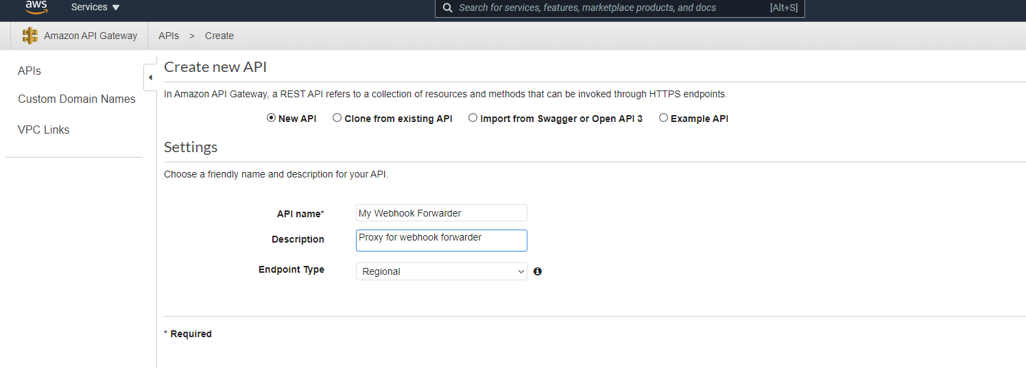 -- AWS Region: select the preferred region where you want the API to be deployed (you can select any)