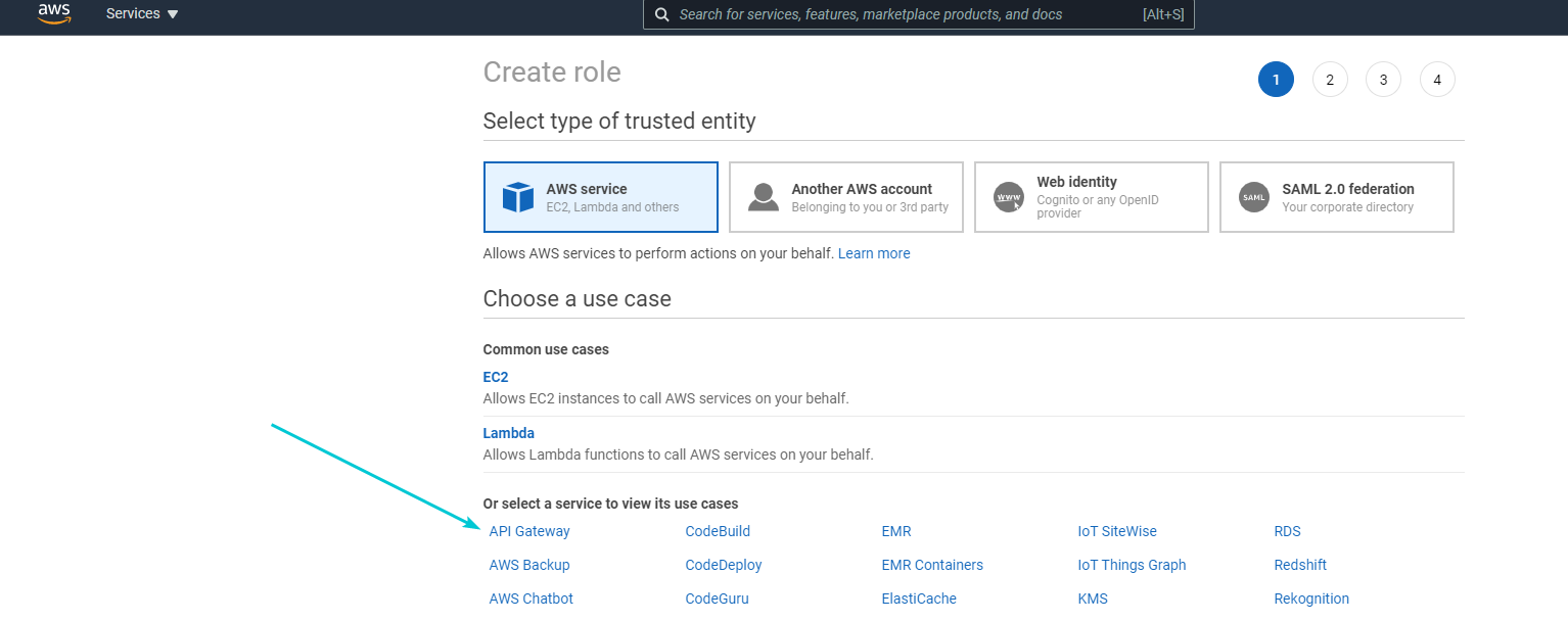 Select API Gateway as service and click on Next:Permissions -> Next:Tags -> Next:Review