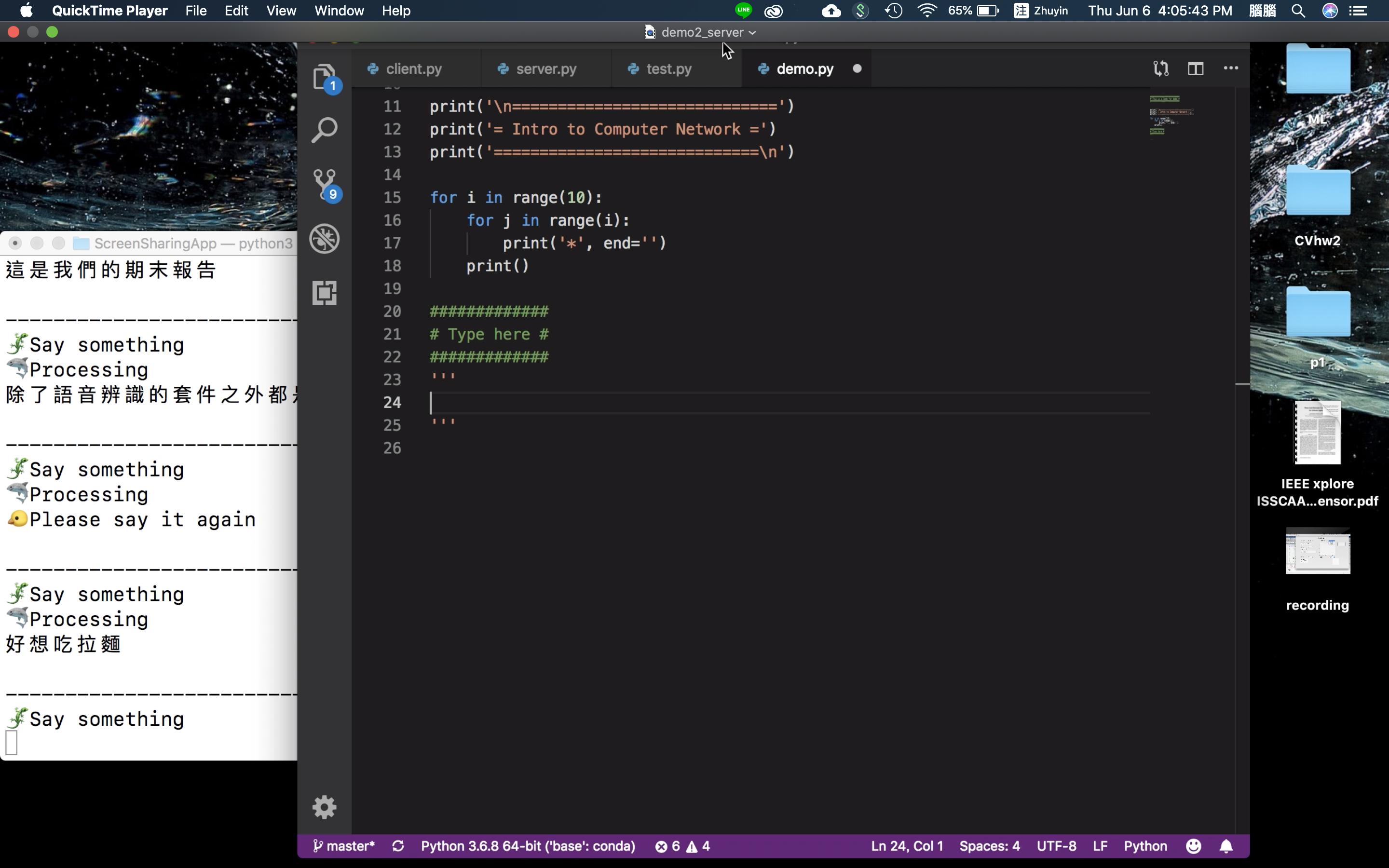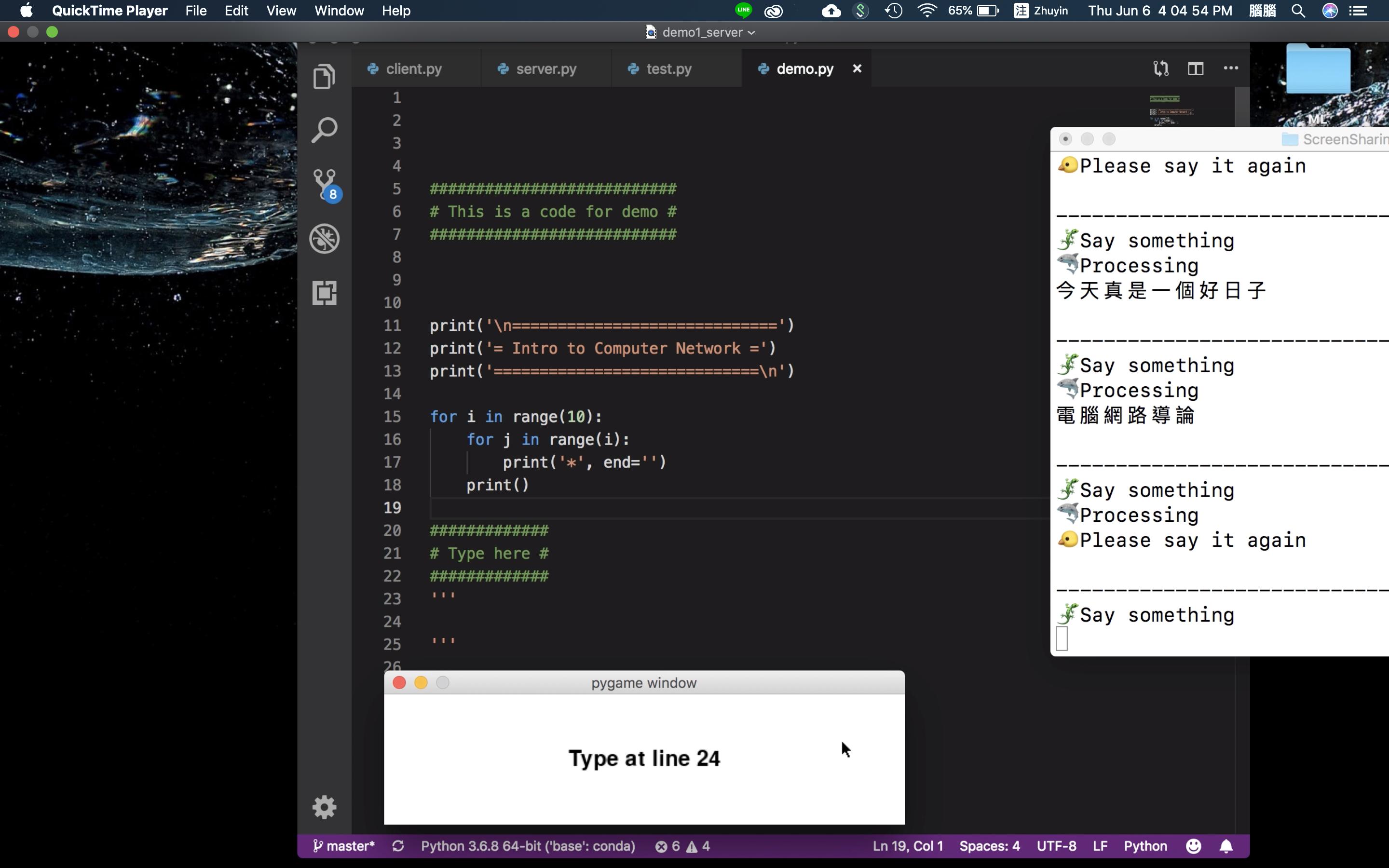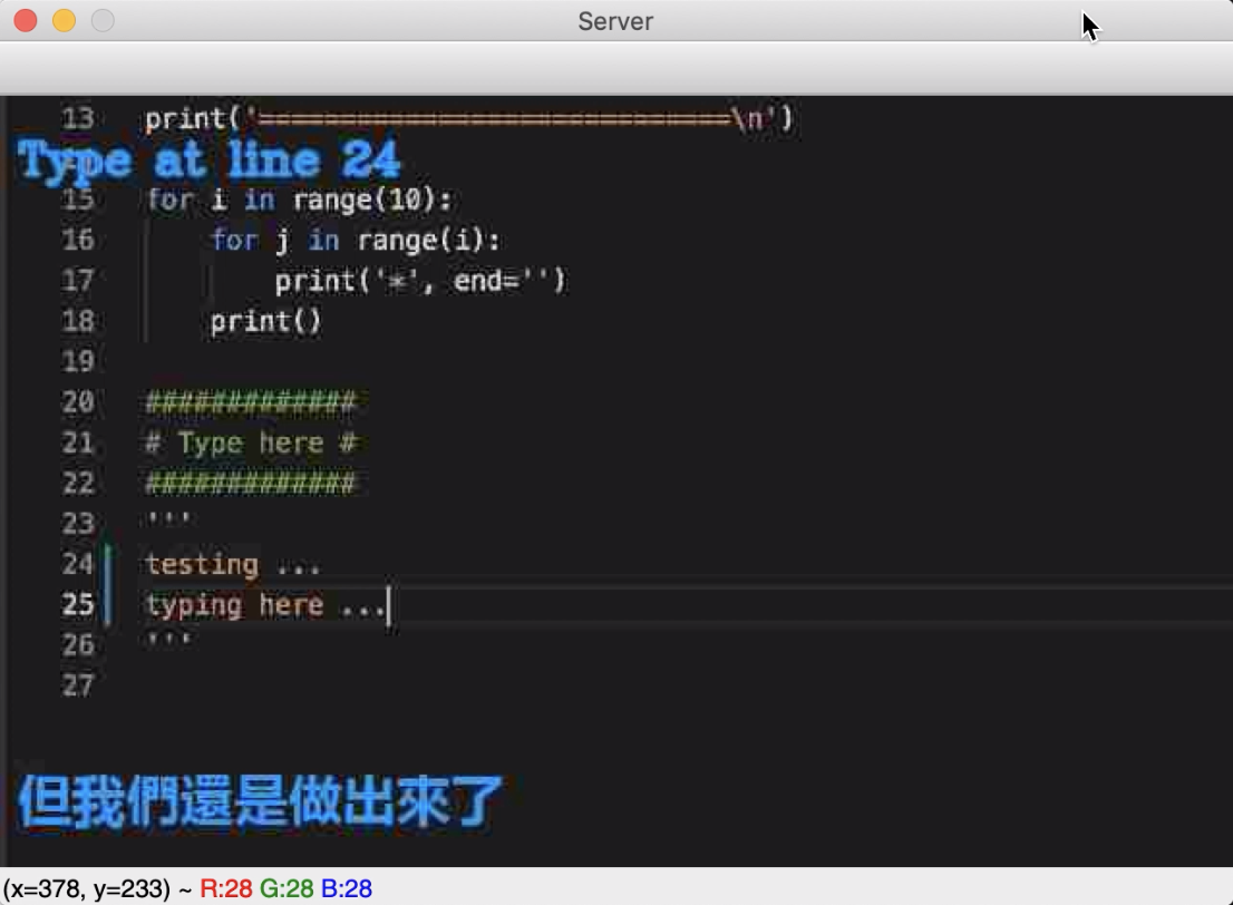 畫面顯示的是server端的螢幕畫面,畫面上方的字是server鍵盤輸入的訊息,畫面下方的字則是server語音輸入的訊息。