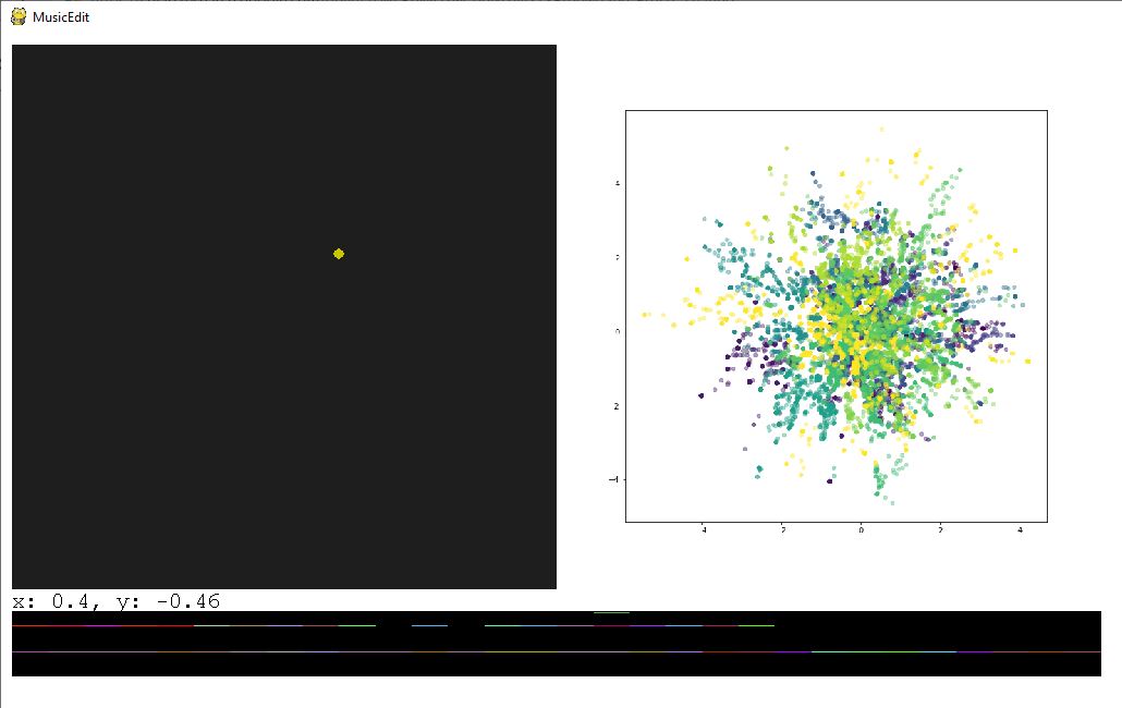 - To generate a new set of notes drag your cursor around the upper left corner box. The yellow dot should move to your cursor location. The yellow dot represents the position of the 2d vector within the latent space.