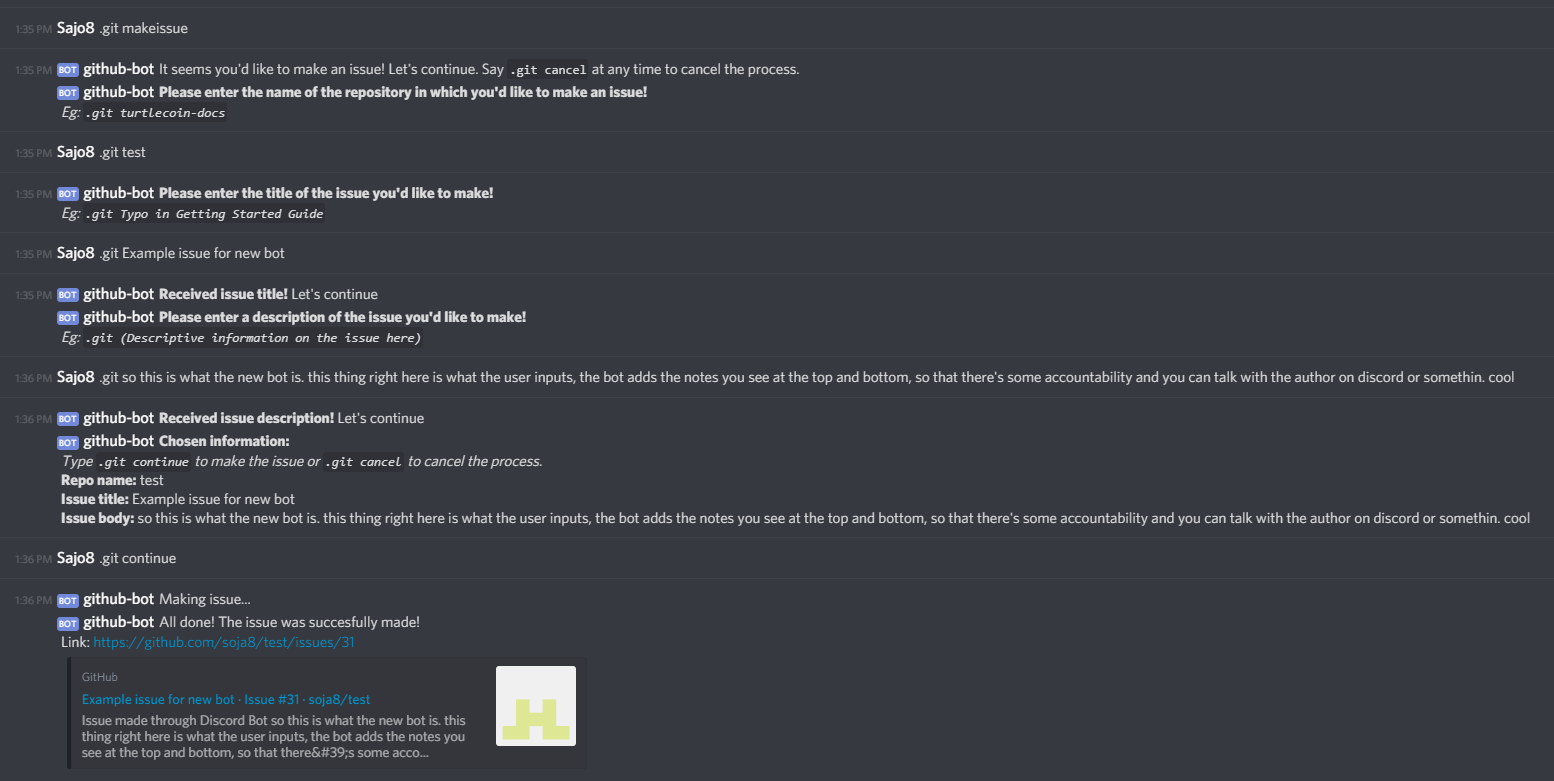 Turtle Git Bot Create a GitHub issue on a repo from Discord! Asks user for repo, issue title and issue body. Creates issue and returns link. Example issue: soja8/test#31 Example process: