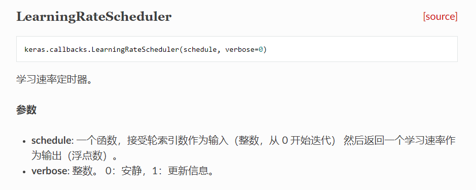 由上方官方文档介绍知,LearningRateScheduler接受两个形参,一位schedule,一为verbose。verbose在这里不多讲,而schedule则是自己定义的函数,schedule接受一个形参(epoch),同时,Model也可传入schedule中,返回一个浮点数作为新一轮的学习率