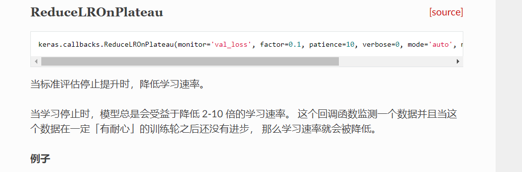 回调器中有两个函数均可对学习率进行操作更改,分别为LearningRateScheduler和ReductLROnPlateau函数,但是两者工作原理不一样。LearningRateScheduler是对每一轮的学习率都进行更改矫正。而ReductLROnPlateau如下图所示,