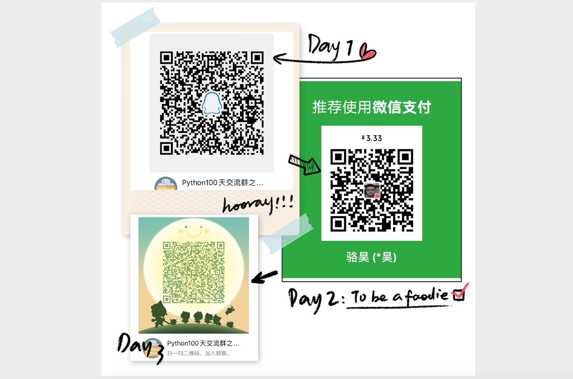 最近有很多想学习Python的小伙伴陆陆续续加入我们的交流群,目前我们的交流群人数已经超过一万人。我们的目标是打造一个优质的Python交流社区,一方面为想学习Python的初学者扫平入门过程中的重重障碍;另一方为新入行的开发者提供问道的途径,帮助他们迅速成长为优秀的职业人;此外,有经验的开发者可以利用这个平台把自己的工作经验无偿分享或有偿提供出来,让大家都能够得到职业技能以及综合素质的全面提升。之前的公开课和线下技术交流活动因为工作的关系荒废了一段时间了,但是各位小伙伴仍然活跃在交流群并一如既往的支持我们,在此向大家表示感谢。近期开始持续更新前15天和最后10天的内容,前15天是写给初学者的,我希望把上手的难度进一步降低,例子程序更加简单清晰;最后10天是Python项目实战和面试相关的东西,我希望内容更详实和完整,尤其是第100天的面试题部分;创作不易,感谢大家的打赏支持,这些钱不会用于购买咖啡而是通过腾讯公益平台捐赠给需要帮助的人(点击了解捐赠情况)。