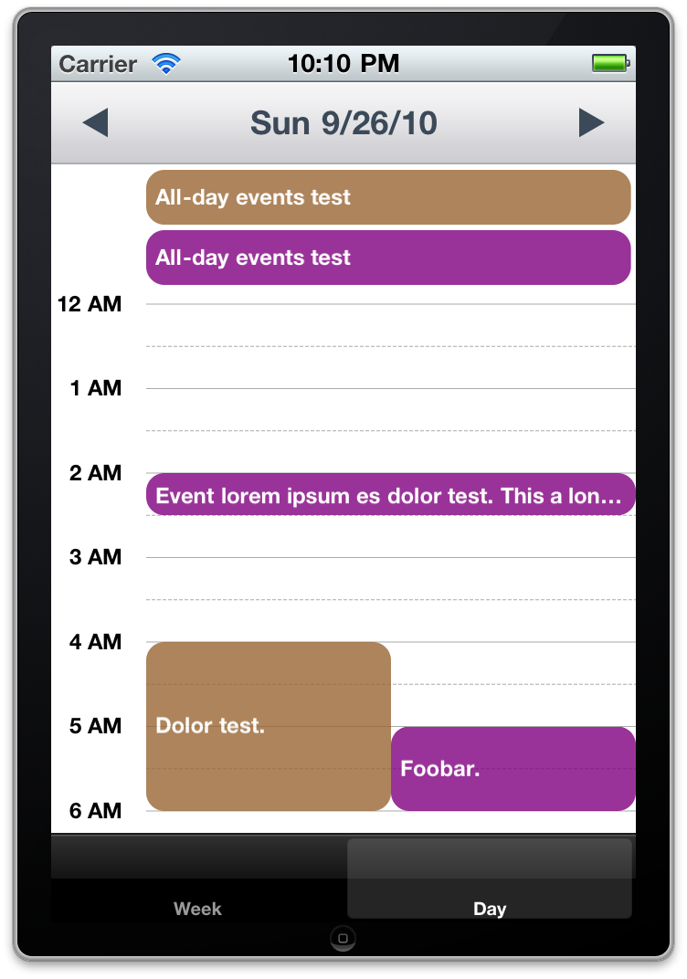 A weekly view for viewing events, displays a whole week. Navigation using the arrows on the top of the view or using the swipe gesture. It has two delegates: MAWeekViewDataSource and MAWeekViewDelegate. To display events in the view, the MAWeekViewDataSource delegate handles callback to a controller to get the event data. If you want to know when a particular events is tapped on, implement the MAWeekViewDelegate protocol.