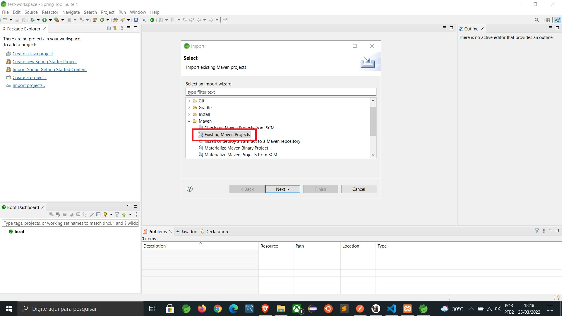 3. Start Spring Tool Suite and import the project using the following path: File -> Import -> Maven -> Existing Maven Projects