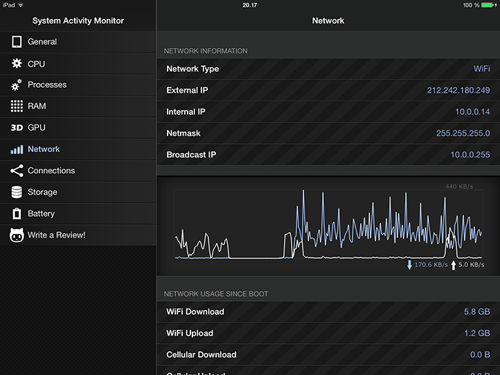 iOS application providing you all information about your device - hardware, operating system, processor, memory, GPU, network interface, storage and battery, including OpenGL powered visual representation in real time.