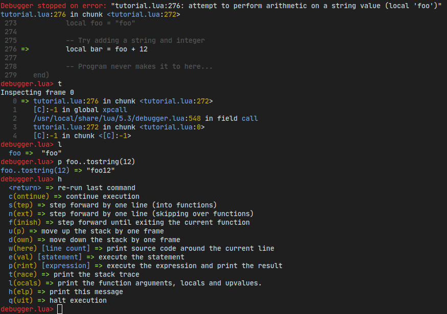 If you have used other CLI debuggers, debugger.lua should present no surprises. All the commands are a single letter as writting a "real" command parser seemed like a waste of time. debugger.lua is simple, and there are only a small handful of commands anwyay.