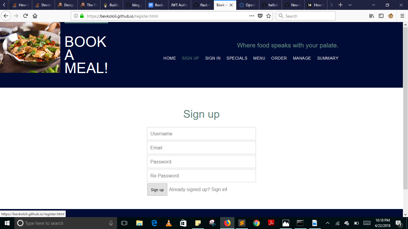 Book-A-Meal is an application that allows customers to make food orders and helps the food vendor know what the customers want to eat. This tracking helps keep work in order. Find it on https://bevkololi.github.io or clone the files from https://github.com/bevkololi/Book-A-Meal.git. You can then open index.html file on your browser. Documentation is also here https://bookameal2.docs.apiary.io/#