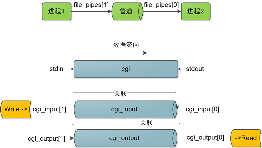 - (9) 在父进程中,关闭 cgi_input 的读取端 和 cgi_output 的写入端,如果 POST 的话,把 POST 数据写入 cgi_input,已被重定向到 STDIN,读取 cgi_output 的管道输出到客户端,该管道输入是 STDOUT。接着关闭所有管道,等待子进程结束。这一部分比较乱,见下图说明: