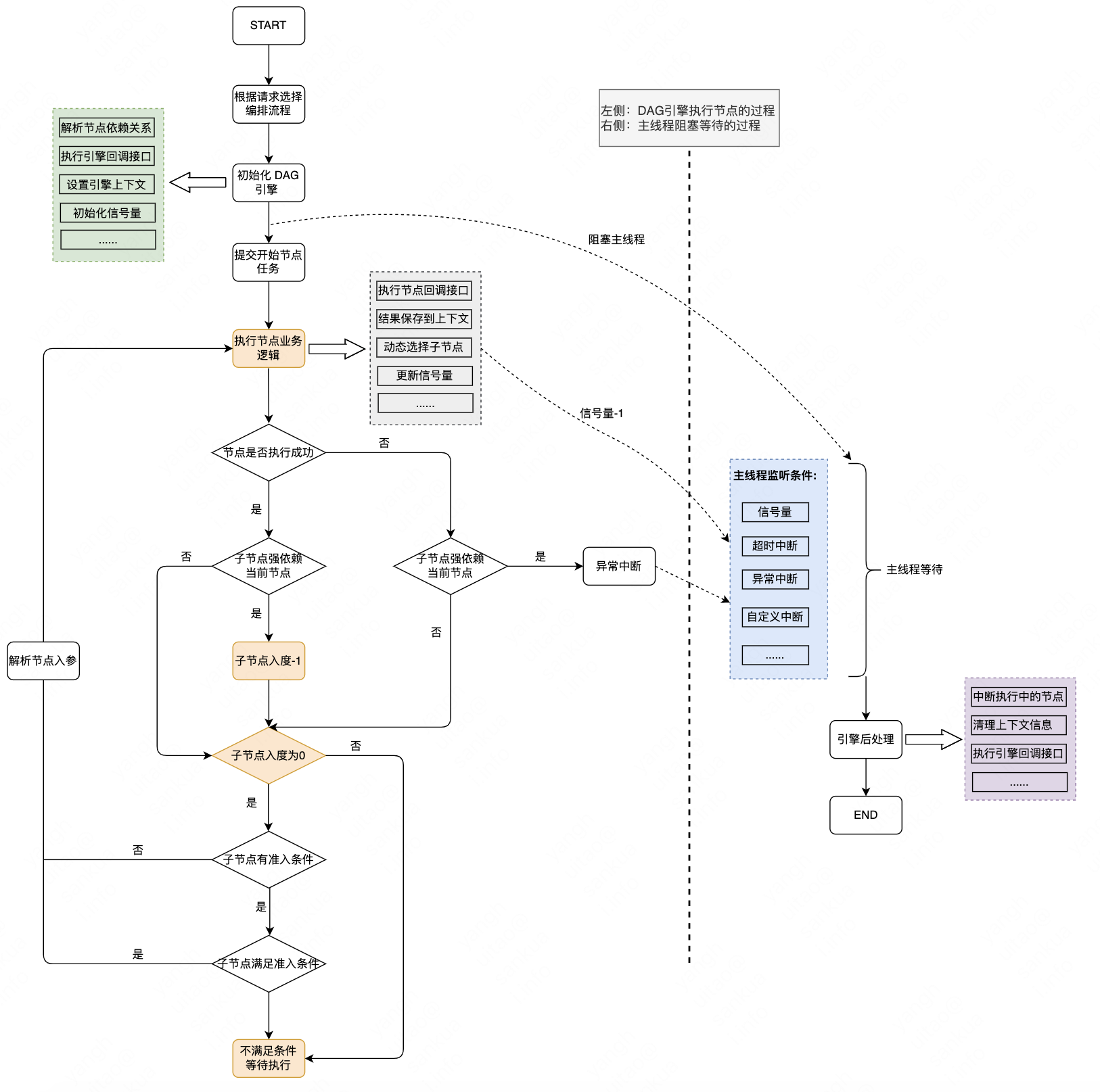 - DagEngine:DAG执行引擎,根据指定的初始节点(如上图的1、2、3),执行相应的编排流程;DAG执行引擎在初始化时可以指定使用不同的线程池,对业务进行隔离;可以设置整个执行过程的超时时间,达到超时时间阈值时,会结束编排流程的执行,没有执行到的节点不再执行同时执行中的节点也会被中断