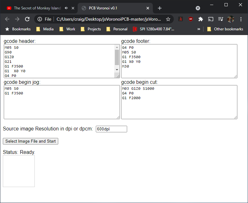 Javascript application to process a circuit board image and output G-code suitable for laser engraver or similar machine. To reduce tool time, the board traces are Voronoi Tesselated. https://en.wikipedia.org/wiki/Voronoi_diagram