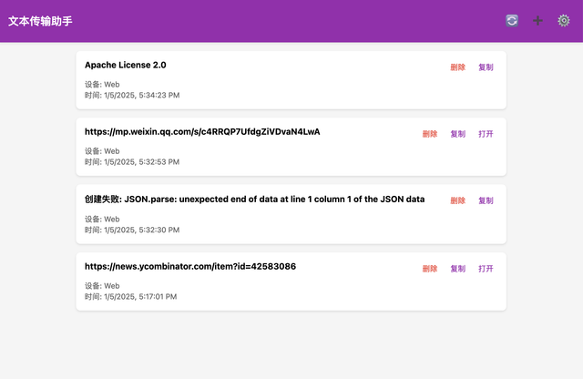 texttransfer 一个轻量级的文本传输工具,支持在 Android 手机和电脑之间快速、便捷地传输文本内容。无需局域网连接,随时随地都能使用。 使用方法 从 Release 页面下载 html 和 apk 文件 打开 html/texttransfer.html,点击右上角的设置按钮,点击“一键生成配置”,然后再打开设置,点击生成二维码。 打开 APP,在设置页面扫描即完成配置。 截图 注意事项 本工具依赖第三方服务,使用前请查看 第三方服务协议。