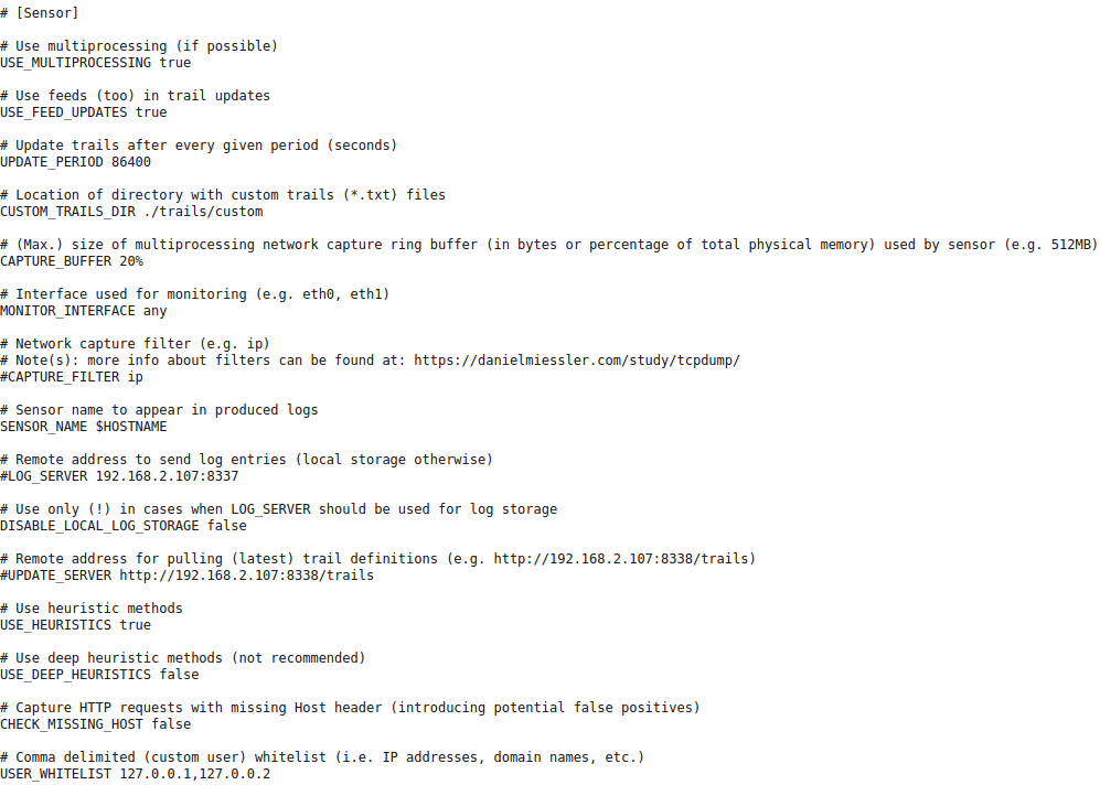 If option USE_MULTIPROCESSING is set to true then all CPU cores will be used. One core will be used only for packet capture (with appropriate affinity, IO priority and nice level settings), while other cores will be used for packet processing. Otherwise, everything will be run on a single core. Option USE_FEED_UPDATES can be used to turn off the trail updates from feeds altogether (and just use the provided static ones). Option UPDATE_PERIOD contains the number of seconds between each automatic trails update (Note: default value is set to 86400 (i.e. one day)) by using definitions inside the trails directory (Note: both Sensor and Server take care of the trails update). Option CUSTOM_TRAILS_DIR can be used by user to provide location of directory containing the custom trails (*.txt) files.