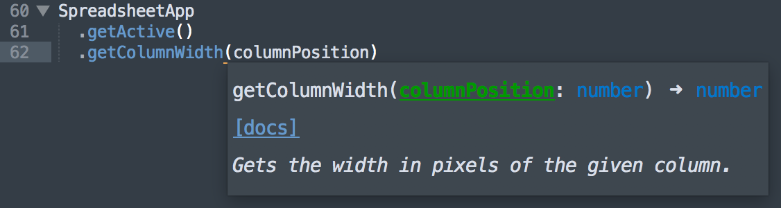 Tern provides many indispensable tools for working with Google Apps Script, such as autocompletion on variables and properties, function argument hints and querying the type of an expression.