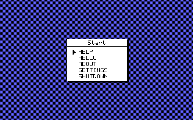 - Apps: A simple menu, a "Hello World" demo, and a Settings page to change the theme.