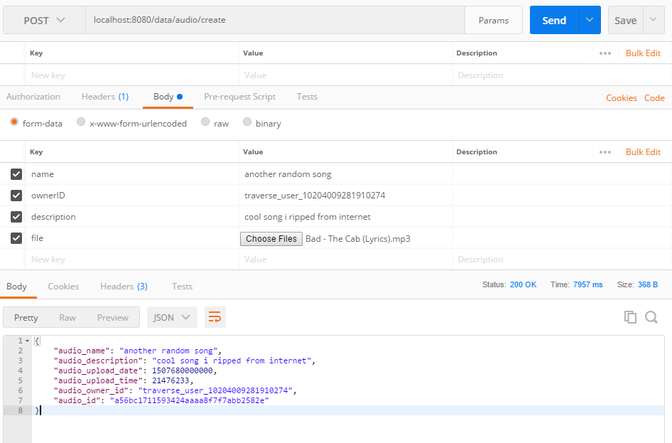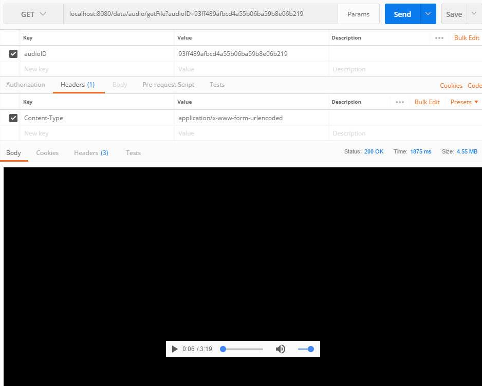 - Since we don't have a front upload audio button, you will need a HTTP testing client to test the POST call.