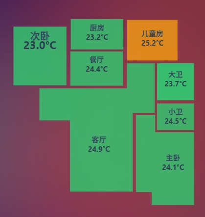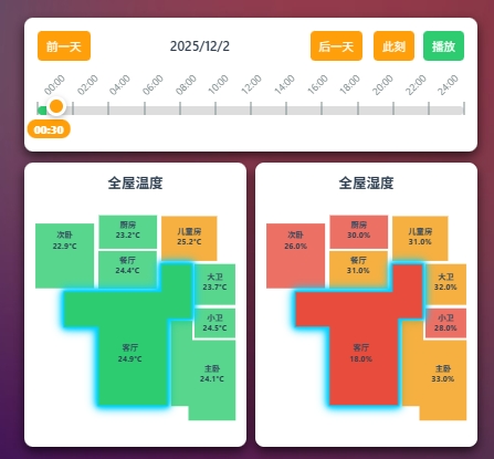 楼层平面图可视化: 使用 辅助工具(房间制作.html,已提供)绘制房间布局,在平面图上实时显示每个房间的温度和湿度值。支持点击房间高亮显示,并切换为主显示区域。 时间线回放:内置时间滑块,支持以 5 分钟间隔回放历史数据。包括播放/暂停按钮、日期切换(前一天/后一天/当前),以及渐变进度条显示可用数据范围。