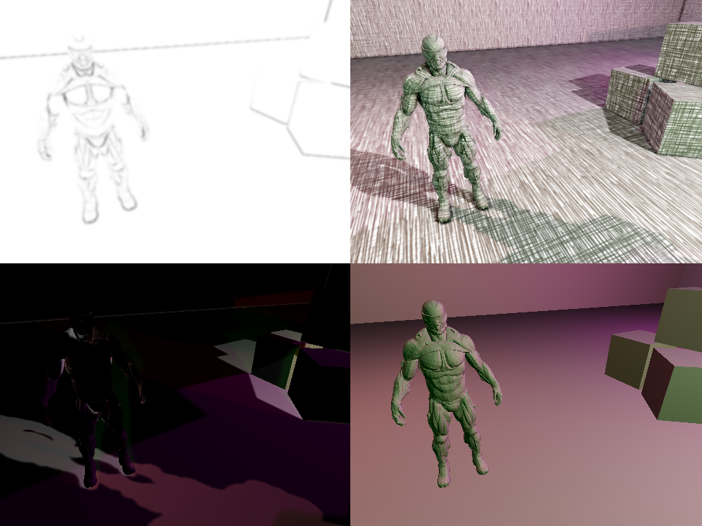 This is a renderer I built as a self-driven final project for COS 526, a graduate level course on graphics. It renders a scene with soft shadows using variance shadow mapping [Donnelly 2006], hemisphere based screen-space ambient occlusion, and real-time hatching [Praun 2001].