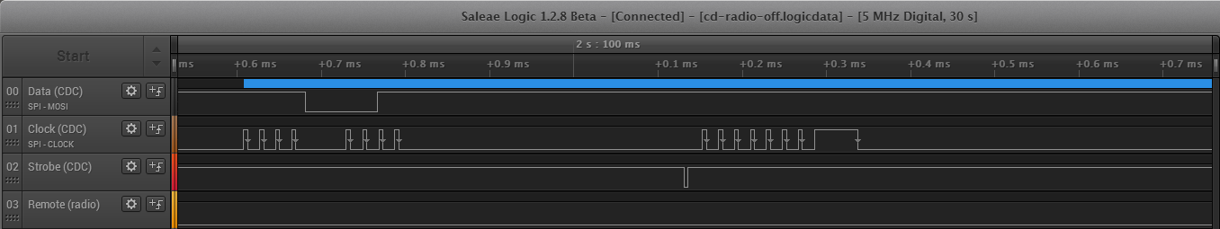 A close-up of the CDC's serial data can bee seen here, with a Logic capture of the traffic between the CDC and radio here (note that the Logic hardware isn't required to view the capture).