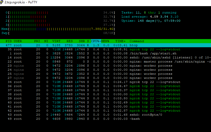 连接成功,我查看了一下htop,哇哦4核32G!!