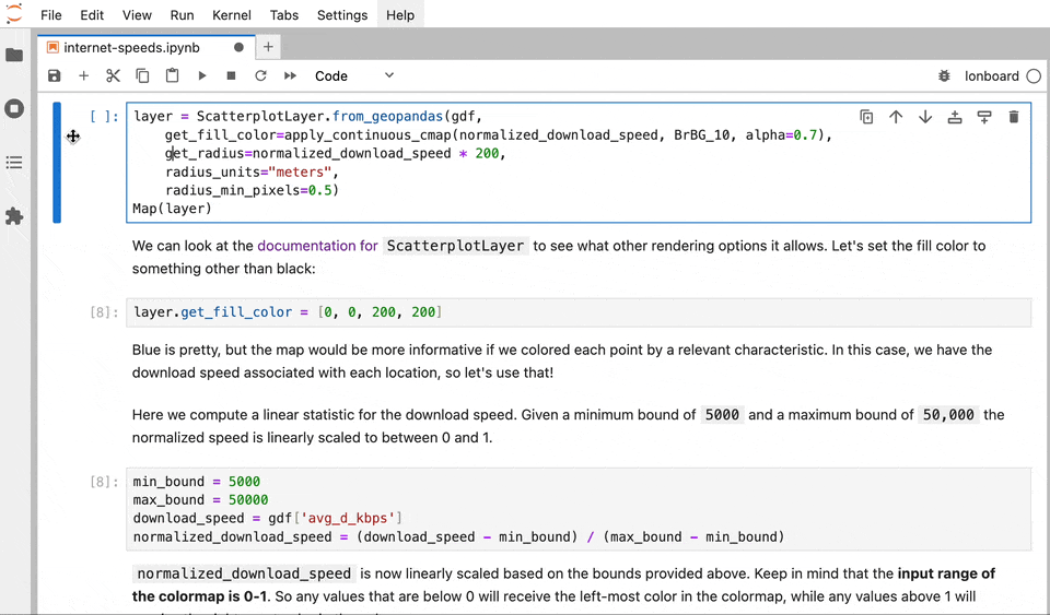 Building on cutting-edge technologies like GeoArrow and GeoParquet in conjunction with GPU-based map rendering, Lonboard aims to enable visualizing large geospatial datasets interactively through a simple interface.