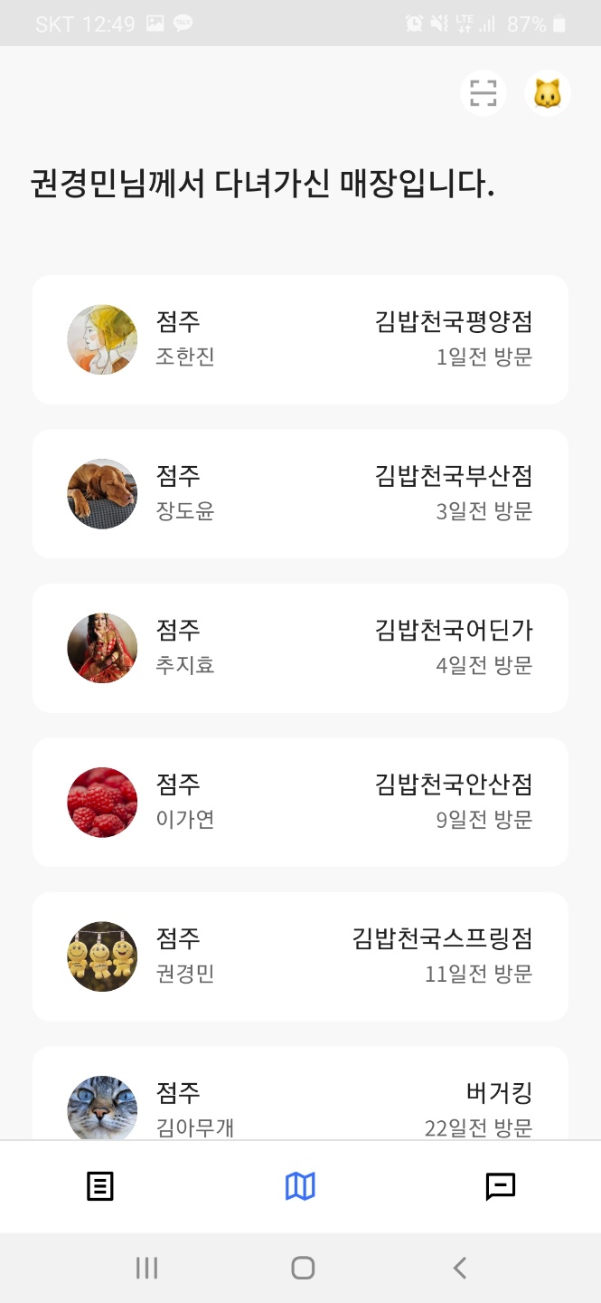 내가 최근 방문했던 장소들의 리스트입니다 점주 이름과 방문 일자를 알 수 있습니다