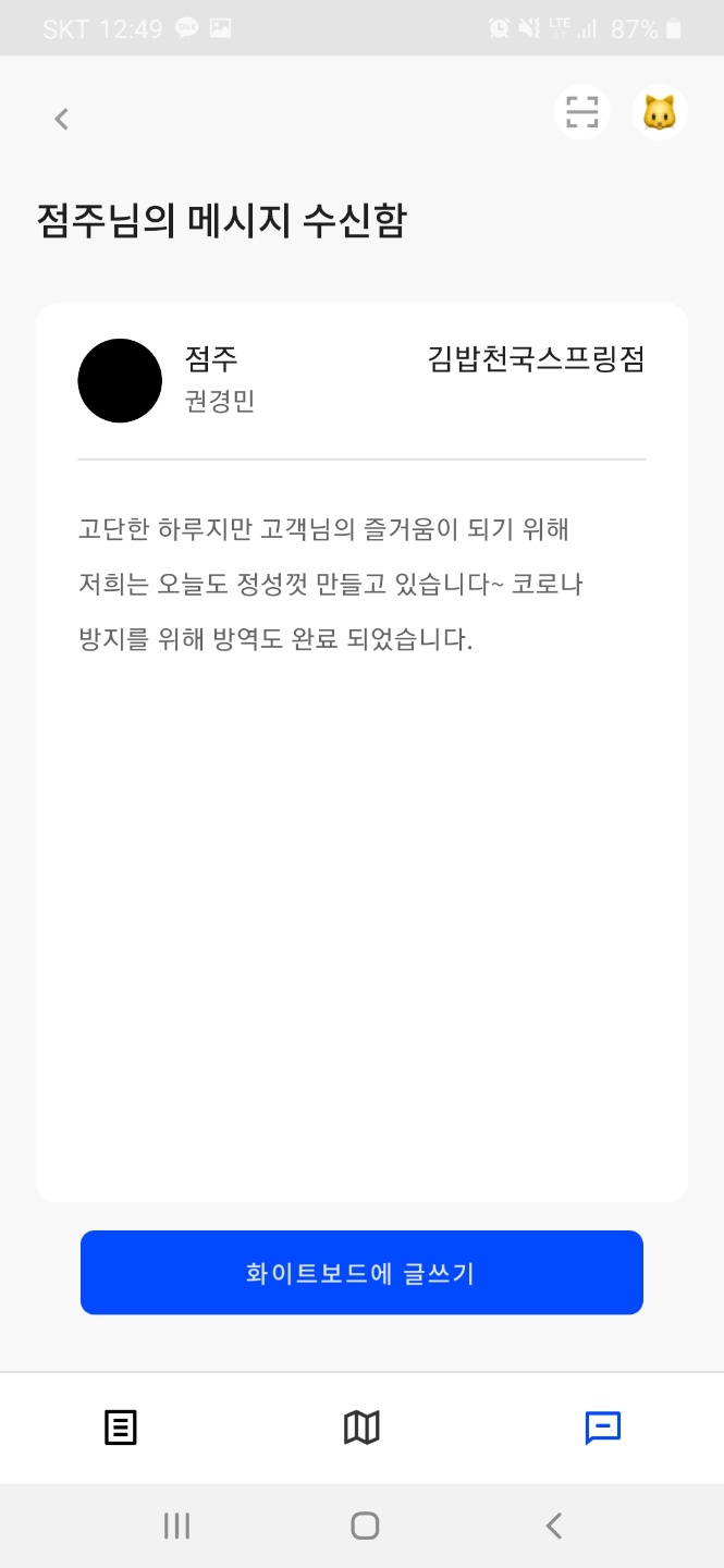 내가 최근 방문했던 장소들의 점주들이 저에게 보낸 메세지함입니다 어느 가게에서 누가 메세지를 보냈는지 확인 할 수 있습니다