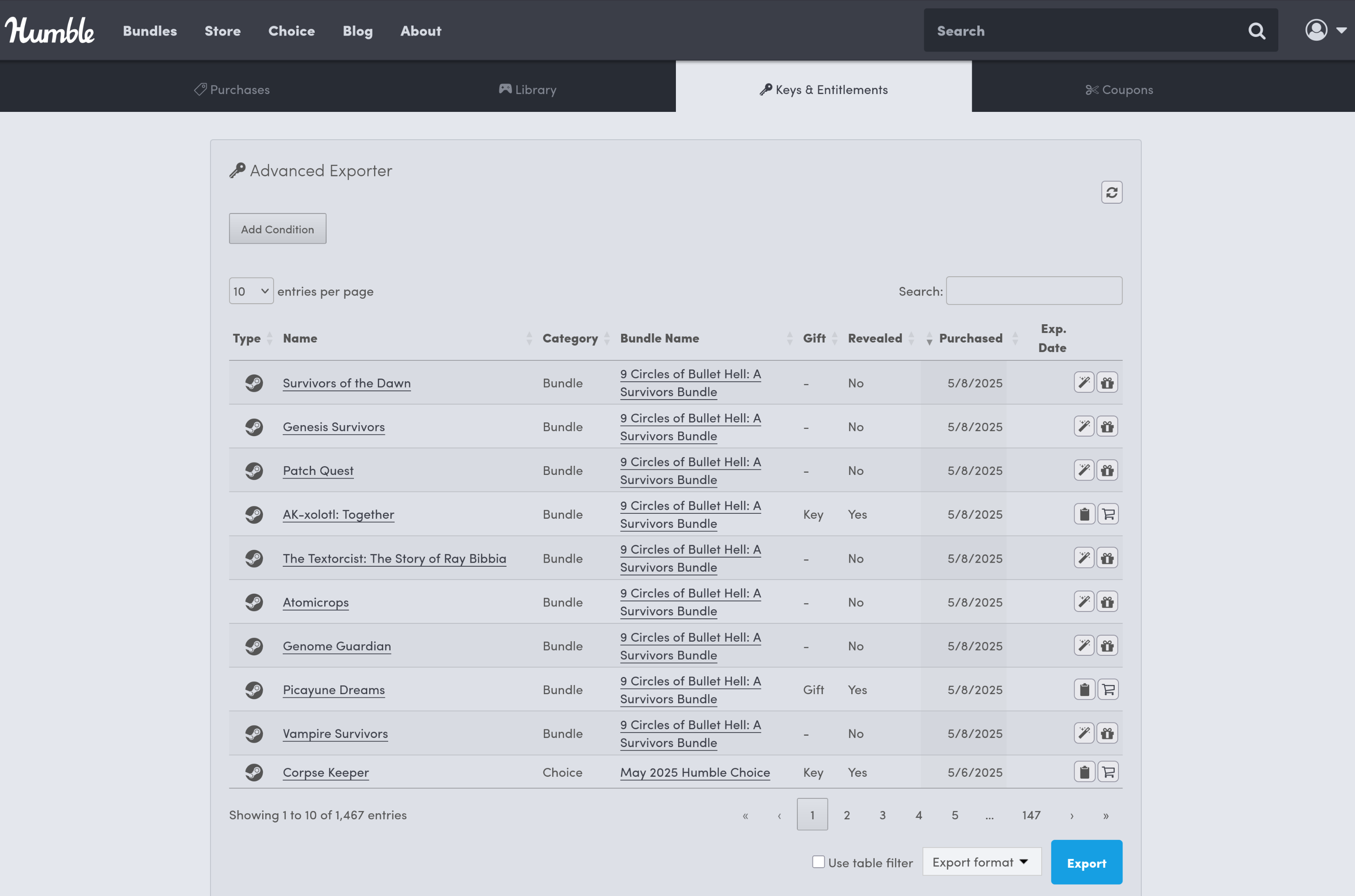 Go to Humble Bundle keys page, open the collapsible menu by clicking on the Advanced Exporter at the top of the main section.