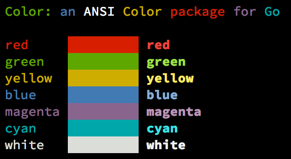 Color lets you use colorized outputs in terms of ANSI Escape Codes in Go (Golang). It has support for Windows too! The API can be used in several ways, pick one that suits you.
