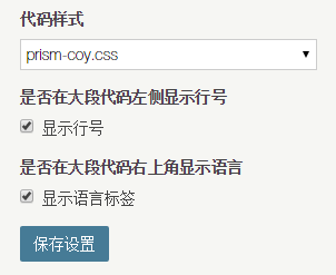 注意 插件文件夹名称必须是Prismjs,否则不能生效。 用法 使用方法很簡單,只要在```或者`之後輸入相應的語言即可,例如: ```c# Console.Write("Hello World!"); ``` 或者行內代碼: `js console.log("Hi!");` 效果 後台參數 後台可以修改的參數如下: