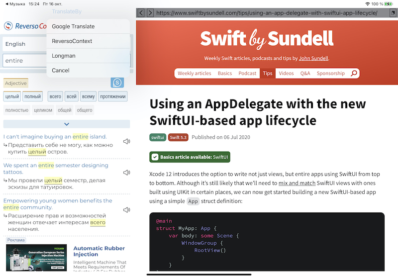 ** update ** As the project progressed I am not feeling to back to UIKit. Being able to craft a new idea in a few minutes on SwiftUI inspire me to continue developing this project. The ability to concentrate on ideas rather than realizations gives freedom to my creativity. As I see now this project, when it already has enough useful features that I use every day. Most likely it will be the ecosystem with various services and additional apps that will help you get the language in. The project that helps to avoid the routine while you read, listen and browse info in your chosen language. Everyone can choose own convenient way to get into the foreign language. I like to move forward all time. If I can not do well now I can do it best tomorrow. I like to choose a convenient way to dive into a foreign language. I don't like to study but I like to explore. I am going to dive into a new foreign language. I think I will get new ideas for new features to use some foreign language from scratch.