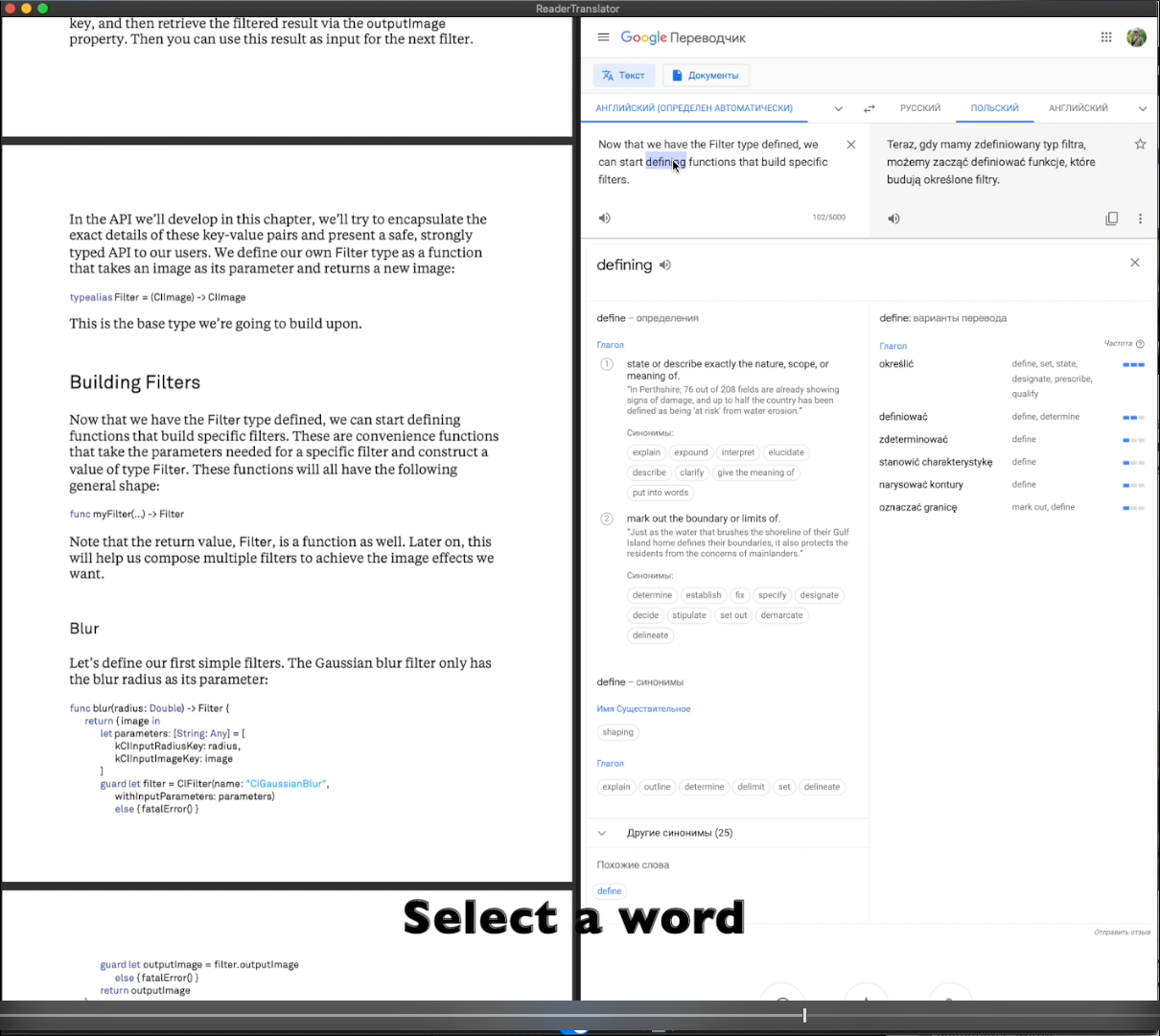 - Apple videos features: Send the current and previous phrase by "<" key to ReaderTranslator