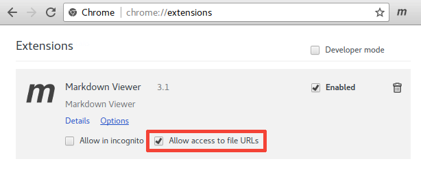 Allow access to file URLscheckbox is checked for the Markdown Viewer extension