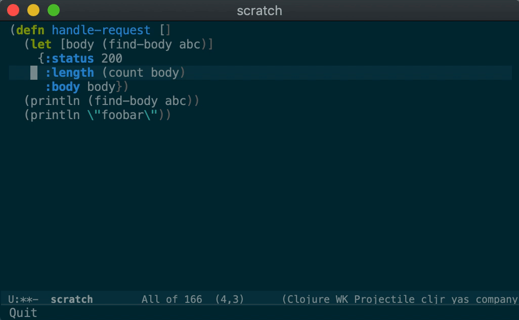 You can also use the code in this package as a basis for extending the font-locking further (e.g. functions/macros from more namespaces). Generally you should avoid adding special font-locking for things that don't have fairly unique names, as this will result in plenty of incorrect font-locking. CIDER users should avoid this package, as CIDER does its own dynamic font-locking, which is namespace-aware and doesn't produce almost any false positives.