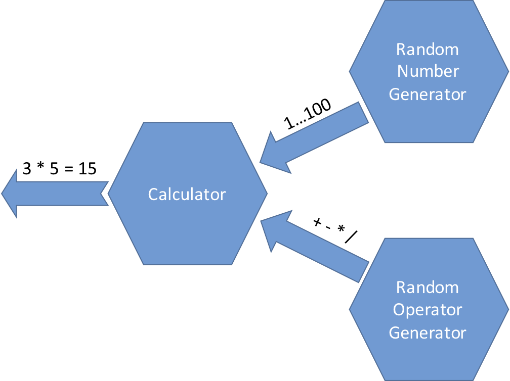 A set of microservices where calculator app invokes the numbergenerator and opgenerator apps to obtain an expression to solve in the form [number][operator][number] (eg. 3+6, 7/5, 8*34, etc.).