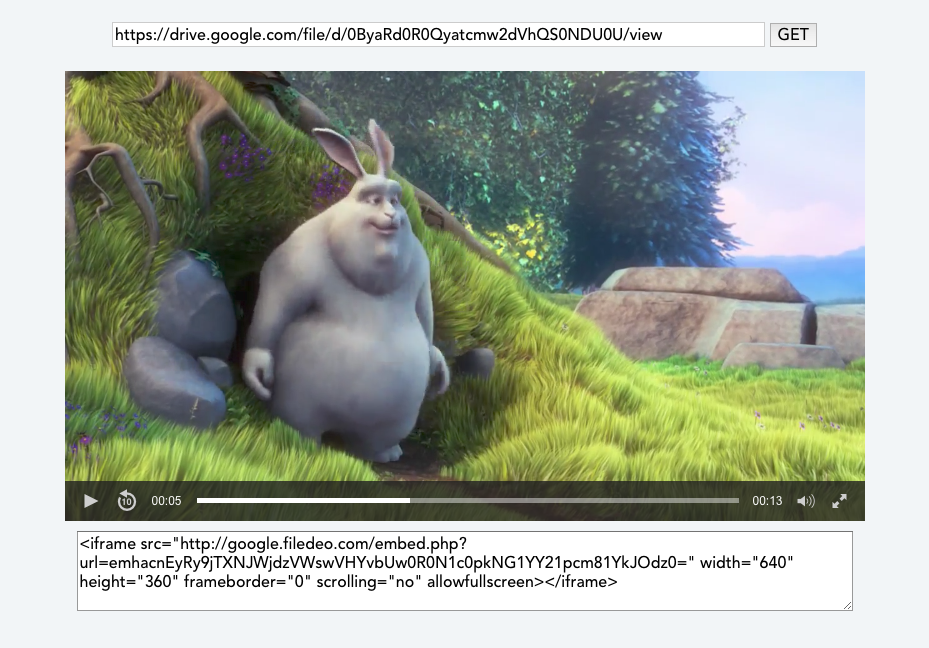 Grab google drive streaming links (redirector.googlevideo.com/videoplayback?..). You can use it for video players (jwplayer, videojs, flowplayer etc).