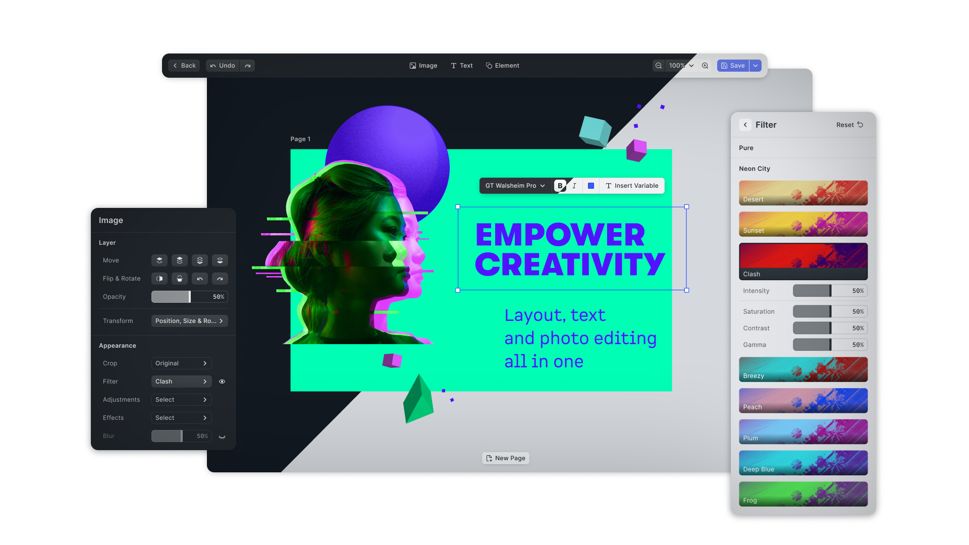 Seamlessly integrate it into any Web app with just a few lines of code. The editor combines the best of layout, typography and photo editing. CE.SDK also facilitates both template creation and adaption workflows, also featuring constraints and text placeholders for database automations.