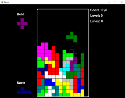 An extension of Alexey Pajitnov's famous game Tetris with pentominos (5-blocked shapes). Created with pygame 1.9.2 and Python 3.5. Pentris comes with basic functionality, such as having a "hold" slot for unwanted pentominos.