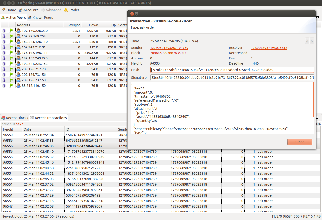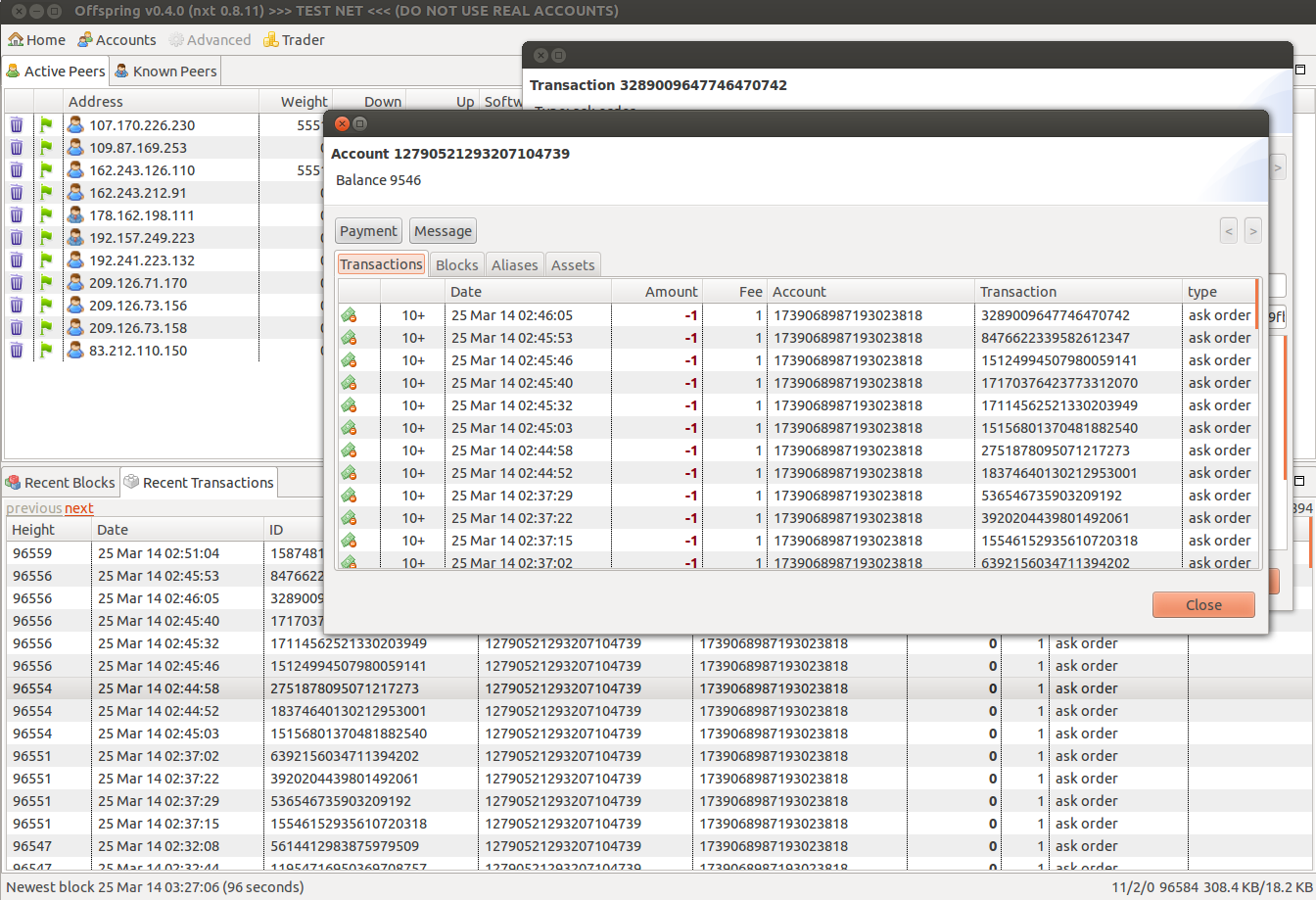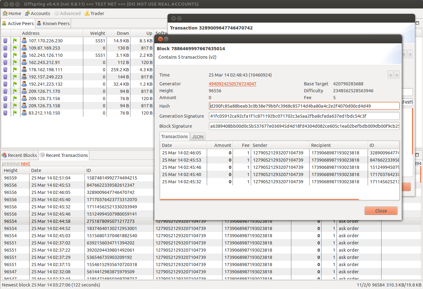 Offspring uses the NXT Java API. This allows for fast access to all data in the blockchain. All displayed transactions, accounts and blocks can be clicked and inspected.