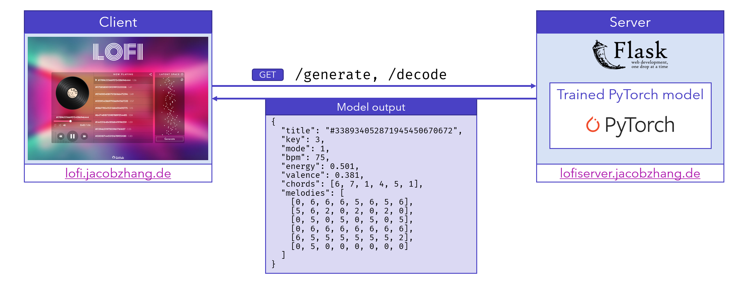 We trained a VAE model in PyTorch to represent a lo-fi track as a vector of 100 features. A lo-fi track consists of chords, melodies, and other musical parameters. The web client uses Tone.js to make a dusty lo-fi track out of these parameters.